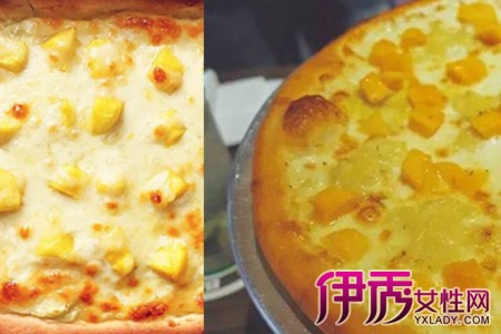 芒果榴莲披萨准备材料:芒果肉、榴莲肉、清水、普通面粉、酵母、食盐、白砂糖、奶酪做法:将面粉、牛奶、盐、油、糖、酵母放入面包机中,搅拌成光滑的面团,成型后,发酵到面团本身的2倍,拿出来排气。面团揉成面饼,铺入披萨盘中,用牙签扎些孔排气。 发酵20-30分钟,面饼微微发起即可,烤箱190度,中层烤3-5分钟,让面饼定型。榴莲肉搅成泥,芒果肉切成丁,面皮上抹上奶酪,均匀放上榴莲肉泥个芒果肉丁,放一点芝士,烤箱上下火200度预热,中层烤20-25分钟至芝士融化就可出炉。