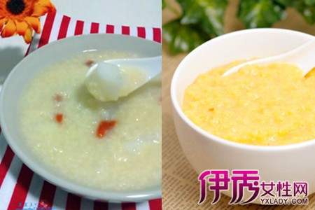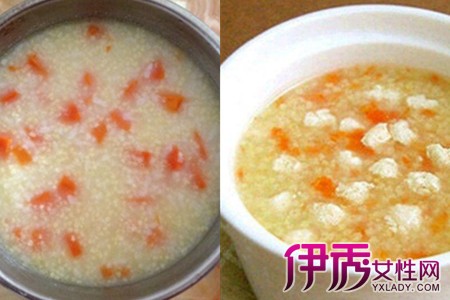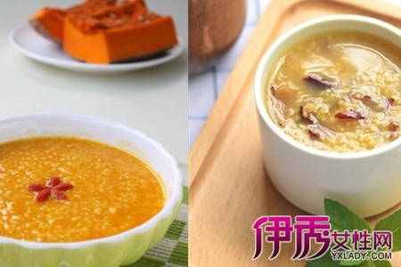 第一种是小米南瓜粥。需要的原料:小米150克,南瓜300克。把南瓜削皮去瓤,洗净切丁。小米淘洗干净,控干水分备用。往电饭煲里加入小米和适量的清水,炖煮一小时。小米煮好后,再放入切好的南瓜,继续炖煮半小时即可。 第二种是红糖小米粥。所需原料:小米150克,小枣8颗,花生仁,红糖15克。把小米淘洗干净,先放入电饭锅用清水泡半小时左右。把红枣洗净去掉枣核,红枣肉切碎待用,花生仁也切碎备用。小米泡好之后,开小火熬煮,小米煮到开花时加入切好的红枣肉,用勺子搅拌均匀继续熬煮。红枣肉煮烂了就加入红糖,花生仁碎,搅拌均匀接着熬,再煮五分钟即可。