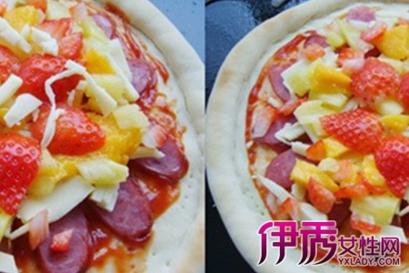 材料:牛奶一百克,面粉两百克,黄油二十克,食盐,酵母适量;芒果,菠萝,草莓,台湾香肠,奶酪,披萨酱适量