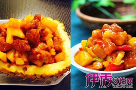 粤菜做法中,有一道关于猪肉的特殊菜品。菠萝咕噜肉又称古老肉,是利用菠萝和猪肉味原料制造而成。首先将菠萝和瘦猪肉分别切成小块,将猪肉用鸡蛋、淀粉、生抽搅拌腌制,再撒上面粉,然后放入油锅里炸至金黄即可捞出。然后将油沥出剩下少量,倒入番茄酱和水烧汁,再把菠萝和炸好的猪肉块一起倒入翻炒,收汁后盛出。有猪肉的香味又有菠萝的清新口感,赢得了很多人的喜爱。