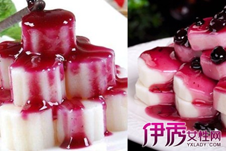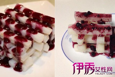 或许有人不喜欢吃山药泥,那接下来我们就来说说另外一种做法,其实做法跟之前差不多,只是外形上有些不同。一样的,先把材料准备好,山药、蓝莓果酱、冰糖、鲜牛奶等。首先要把山药洗干净,去皮,切成条状或者圆柱状,接着把切好的山药放在水里煮熟,在煮山药期间就可以用另一个小锅,加入少量清水,然后把冰糖和牛奶一起煮一下,直至冰糖融化,然后倒在容器里,放进冰箱降温。待山药熟透后捞出,放进之前冰冻过的冰糖水里浸泡大概一小时后捞出,在盘中摆放整齐,然后再淋上蓝莓果酱即可。【女物原创未经允许,谢绝转载!】