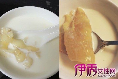 由于珍贵,所以很适合用来补补身。还有养颜的作用,有一种做法真的是很适合女人吃。花胶隔一个晚上就浸泡好,等它浸泡软后,拿出来洗干净(因为它表面比较多杂质,所以一般都是选择用牙刷来慢慢刷)。取出煲来,里面放适量的清水,等它煮开后把泡好了的花胶放进去出出水,出好后把花胶横竖切成一粒粒的,切好后把它放到一个小炖盅里面,再放一片生姜,加少许的清水(不要太多),加适量的白冰糖,把它盖好,放到汤锅里面隔水小火慢慢炖,2小时左右后,把炖盅的盖揭开,开入适量的鲜奶,再慢火炖多3分钟就可以食用了。真的很养颜!