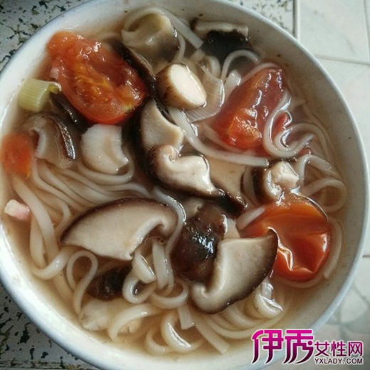 另起一锅水煮开等煮面,同时起油锅放入香菇爆香,待香气出来就放入红萝卜,略为翻炒后加入切块的番茄,将番茄炒到出水(若水分不足怕干锅可加一点香菇水),然后下肉丝,及酱料,将肉炒熟后加入剩余的香菇水煮开做汤底。