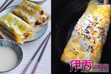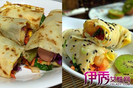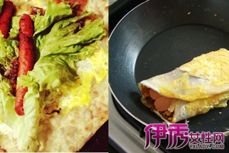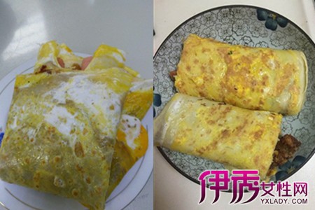 摆食材的时候尽量往上摆,下面尽量留出空位。用手轻轻地把两边面皮包起来,一个煎饼果子就做好啦。面皮的薄厚可以根据个人喜好来定,水多加些面皮就薄些,水少些就厚些。面皮不要煎太硬,不然不好卷。面皮中夹的食材可以根据个人喜好添加。【女物原创未经允许,谢绝转载!】