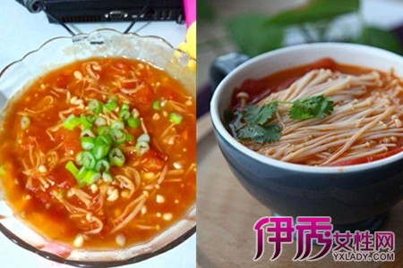第一道是茄汁金针菇。需要准备材料有:金针菇,番茄,盐,食用油。先把番茄洗好切成薄片,金针菇去掉根部,清洗干净,并把连在一起的金针菇掰散。热锅下油,油温升高六七成热,下番茄片,煸炒一分钟。然后撒入适量食盐,继续煸炒片刻,加入适量清水,盖上盖子大火煮十分钟。时间到,番茄已经煮软,用工具把番茄的皮夹出来,继续盖上盖子煮五分钟。煮好后,加入洗好的金针菇,盖上盖子煮八分钟。最后把汤汁收干就可以盛出锅了,拌饭拌面都非常棒喔!