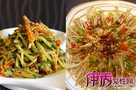 第二道是凉拌金针菇。用料:金针菇,青椒,红椒,黄瓜,蒜泥,醋,香油,熟芝麻,香菜,生抽熟芝麻。先把金针菇去头,洗净,连在一块的用手撕开。烧一锅开水,把金针菇放入锅里,稍微煮两分钟,然后捞出锅,冷却并控干水分。把香菜洗净切碎,黄瓜,青椒红椒洗净都切丝,大蒜剁成蒜末待用。拿碗装起控干水分的金针菇,加入适量的生抽,麻油,鸡精,盐,蒜末,黄瓜丝,青椒丝,红椒丝,熟芝麻,用筷子拌匀即可。