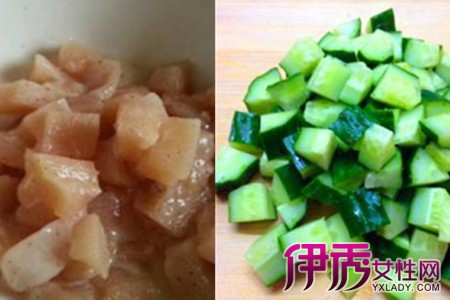 然后把准备好的食材做下处理,鸡肉切丁,大概切成1厘米左右正方形的小方块,加白糖,盐,料酒和淀粉拌匀,大概淹10-15分钟左右即可。黄瓜也切成和鸡肉一般大小的丁,花生可以用买来的酒鬼花生,也可以用生花生炒熟备用。