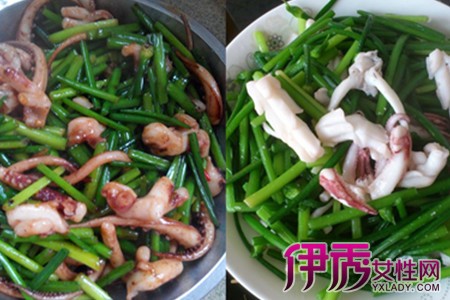 在炒的时候要不停的翻炒,待鱿鱼炒至六七成熟之后,就可以将韭菜放进锅了,放入韭菜之后依旧要不停的翻炒,在起锅之时放入盐就可以了。有人很疑惑,在烹饪这道美食的时候,并没有添加葱姜蒜,那是因为韭菜本来就有很浓烈的味道,不用添加姜和蒜味道依旧很美。
