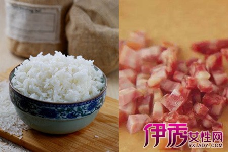 1、凉米饭一碗,腊肉切成粒状。