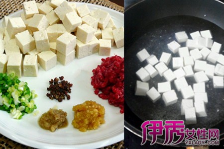 先将食材准备好,取两三块豆腐,用刀切成正方形的小块。将猪肉或是牛肉切成丁状,准备好葱花以及姜片。先烧水,将切好的豆腐块放入热水中,放入少量食盐去除豆腥味,大约十五分钟左右即可捞出。然后添加食用油烧热煸炒花椒八角姜片等爆香,将肉丁放入翻炒,大约六七分钟即可放入豆瓣酱一起煸炒,再倒入盐、料酒、酱油以及清水。