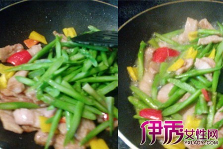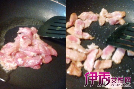 准备工作就绪后,就是起火热锅放油,下腌制的猪肉爆炒。当肉变色后,再把芦笋倒下,翻炒一下后,稍微加点水,盖上盖子,焖煮四五分钟。
