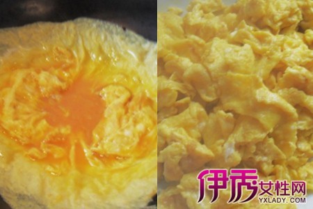 准备就绪后,起火热锅放油,下蛋液翻炒。这时候一定要用猛火,手要勤。要不然,这蛋容易焦。蛋液成块后,捞出备用。