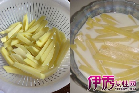 第二步,取两勺淀粉,用一碗水化开。把切好的土豆条倒进淀粉水里,让其充分浸泡5分钟左右,然后捞出滤干水份。想要炸出的薯条不会太硬,这一步可是关键。