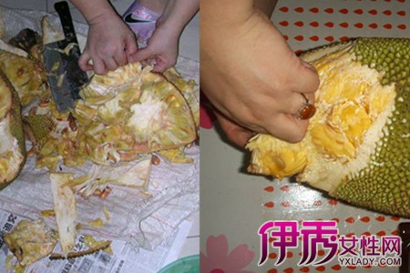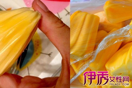 切菠萝蜜时要从它的中间下刀,切成两半之后用方便袋把它中间白色的粘液粘下去。白色的东西去除了以后就能看到黄色的菠萝包了,可以用手把这个菠萝包拿下来,黄色的果肉就是菠萝包,它里面会有一颗种子,吃的时候要先抠出来再食用。