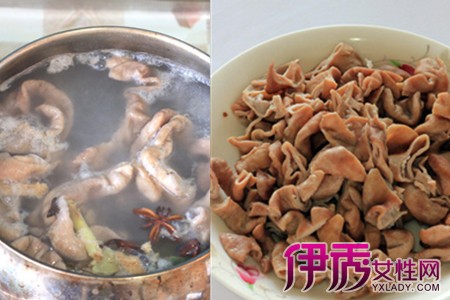 食材:猪大肠500克、干辣椒、花椒、大料、香叶、桂皮、白糖、味精、料酒、生姜、大蒜。大肠翻面,装入容器中,倒入食醋和食盐,拌均匀,反复揉搓,洗掉大肠内壁的粘液,最后用清水冲洗,把大肠洗干净为止。