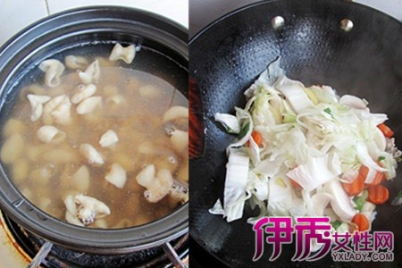 食材:猪大肠、大白菜、胡萝卜、口蘑、粉丝、葱、姜、食盐、料酒、胡椒粉、酱油、鸡精、蒜苗、香菜。猪大肠翻面清理干净,切块待用。粉丝提前泡软,大白菜洗净切段,胡萝卜切片,口蘑切片。在锅里倒入清水,滴几滴料酒,煮开。放入洗净的大肠,烫几分钟。