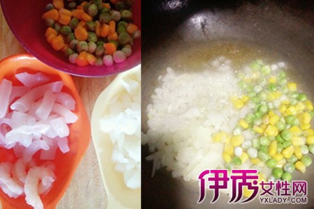 将玉米、洋葱切成丁。切丁的目的是让它们的香味可以更加渗透到饭中。