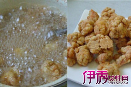 5、油锅下足够的油,文火浇到八分热的时候,把肉放进去炸到微黄,捞出来沥干。加多点油进去继续加热,油五分热时,把炸过的肉再放进去,大火重复炸一次,炸到肉变得酥脆金黄时,捞出来备用。要注意快速地翻炸,不要炸黑了。可以把炸过的肉放到厨房吸油纸上,以吸去多余的油份。