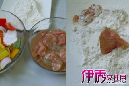 3、在切好的肉里加入蛋清、姜汁、胡椒粉、盐搅拌腌渍三十分钟。同时将洋葱与彩椒都切成块,淀粉与面粉混合起来。