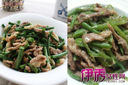 肉丝六七分熟的时候即可放入豆角和红辣椒,豆角不易熟,所以最少需要十五分钟的时间。翻炒的时候放入少许清水是可以预防粘锅的,而且有点汤汁会使菜肴更加入味。快要出锅之前再放入食盐、味精等调料。【女物原创未经允许,谢绝转载!】