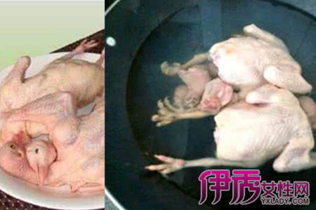 然后,把乳鸽头脚切去。把乳鸽切成大小适中的块状,所有食材加入砂锅中,炖煮两个小时。