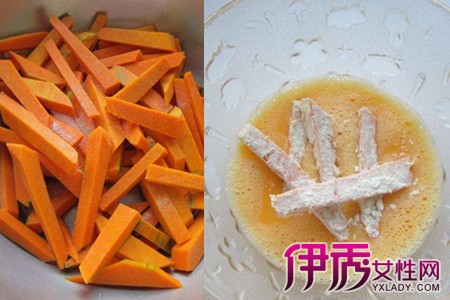 把裹上干淀粉的南瓜条裹上鸡蛋液,再裹上面包碎,放在盘子上静置三分钟。在锅里放入食用油,稍微多一些,开火烧热,油温烧至六七成热时,轻轻放入裹好面包碎的南瓜条,小火慢炸,炸至南瓜条表面颜色变成金黄酥脆,即可捞出锅。大火烧开锅里的油,再次放入南瓜条炸制一分钟左右,即可捞出锅控油。【女物原创未经允许,谢绝转载!】
