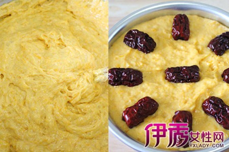 然后加入面粉,搅拌成南瓜谷面糊,封上保鲜膜,静置发酵,使面团变成原来的两倍大。用筷子搅动发酵好的面糊,把面团中的空气排出去。在蒸发糕的容器表面均匀地涂上食用油,把面糊放入容器中,再静置发酵十分钟左右。红枣洗净一切为二,整齐地摆在发酵好的面糊上,然后放入蒸锅中,大约蒸四十分钟,就可以出锅了。