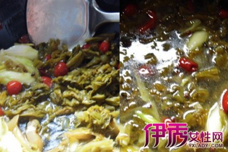 其次,下酸菜。这步简单,只需要适当翻炒,让酸菜沾染上辣椒的辣味即可。