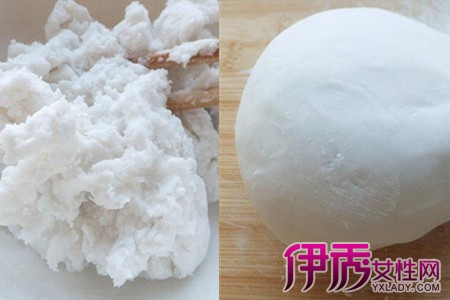 把澄粉和木薯粉一起放入一个大容器中,撒入适量食盐,搅拌均匀。加入300ml开水,一边加水一边搅拌,搅拌至没有干粉,盖上盖子静置五分钟。五分钟后,在案板上撒些干粉,把面糊取出,放至案板上,揉搓成面团。然后加入少许猪油,再一起揉搓,揉搓至面团表面光滑。