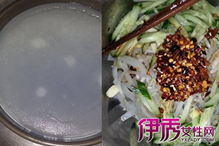 蒸熟后,取出放在凉水上,可以加快冷却速度。冷却后,取出面皮,用刀切细条,放入冰箱冷藏一会。取适量凉皮,加入豆芽、黄瓜丝、香菜、油辣子、陈醋等等配料,搅拌均匀,就可以食用了。