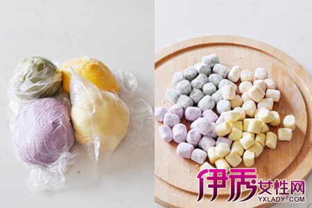 白薯泥加适量清水和一勺白砂糖,打成泥状,加入250克的木薯粉,揉成面团。把面团一分为二,取一份加入适量的抹茶粉,揉搓均匀。南瓜削皮,去瓤,放入蒸锅中,蒸半小时。蒸熟后,取出放入碗中,加入适量清水和一勺白砂糖,用搅拌机打成泥状,倒出,加入125克木薯粉,揉成面团。