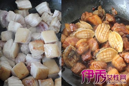 把五花肉的表皮面朝下码在锅里,是为了把肥油煸出来,这样煮出的五花肉就肥而不腻。炖煮五花肉的过程,可以偶尔开盖,翻炒片刻,再盖上锅继续炖煮,这样可以防止糊锅又可以让每块红烧肉入味均匀。鲍鱼不需要长时间炖煮,否则其肉质会变硬,口感不好,等到五花肉八成熟后再下锅。