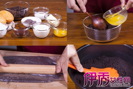 2、把蛋黄、白砂糖、牛奶倒入碗里。锅里放入清水,把蛋黄碗放进去隔水边小火加热,边不停地搅拌,不要让蛋黄受热变成絮状。再加入巧克力,继续不停搅拌让它充分融化。再加入可可粉(之前最好过一筛,减少颗粒),继续搅拌。等加进去的东西全都变得均匀了之后,把巧克力糊糊移出锅外,晾凉备用。
