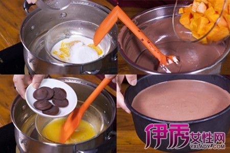 准备材料:饼干碎一百二十克、黄油五十克、蛋黄四个、白砂糖一百四十克、巧克力四十克、可可粉三十克、牛奶五十克、淡奶油四百克、芒果丁五百克。