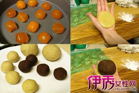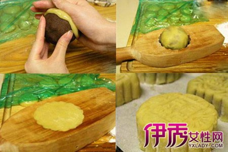 第三步,就是包月饼。去一份月饼皮,轻轻在手掌中压平,放在月饼馅(就是准备好的咸蛋黄),用月饼皮将月饼馅包住,用月饼表层一层干面粉,放进月饼磨具,轻轻压平后轻轻敲敲模具月饼就出来了(在将月饼放进模具之前,用干面粉在模具中扫过一遍,以免月饼粘在上面不脱落),月饼形状也就做好了。