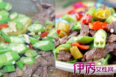 秋葵炒至变色,加入适量食盐,炒匀后盛出锅待用。把锅洗干净,另外倒入一些食用油,烧热,下腌好的牛肉片,煸炒。牛肉片炒变色后加入刚才炒过的秋葵,翻炒均匀,即可出锅。
