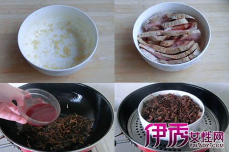 第三步,切肉和梅干菜。将炸好的猪头切成0.5厘米厚的片,梅干菜泡发后切成碎(如果是酸菜就不用泡,直接切成碎)。切好的梅干菜放入油锅中炒好,加入适当的生抽、腐乳汁翻炒均匀后起锅。拿一个大碗,在其中均匀的地抹上油(用猪油是最好的)和糖,将切好的肉片整齐的码在碗中。把炒好的梅菜平铺在猪肉上面。