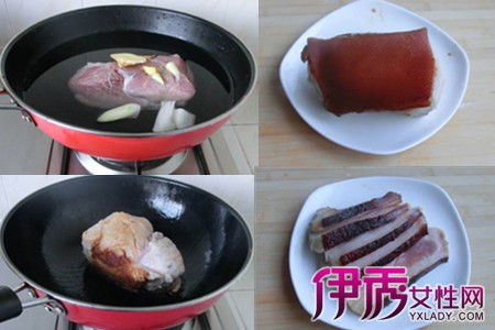 第一步,煮猪肉。先要把五花肉的肉皮刮洗干净(皮上有猪毛因此可以先用热贴烫一下猪皮,再将猪毛一定要刮掉)后,将其放入冷水锅中用大火煮至八成熟(千万别煮过熟,这样会使得猪肉变老)。