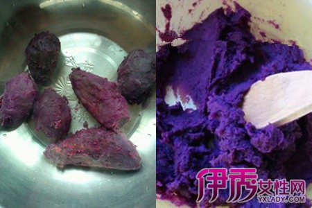 第三步:用筷子戳一下紫薯是否变得柔软,要是筷子能够轻松的戳进紫薯里面,证明紫薯已经煮好了。将煮好的紫薯捞出来之后,先去掉表皮,在这一步中注意烫手。
