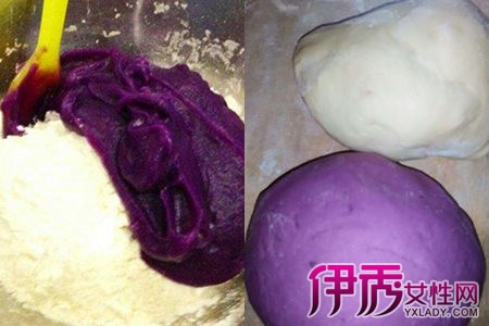 第五步:将调好味道的紫薯泥加入面团中,变成紫薯面团。