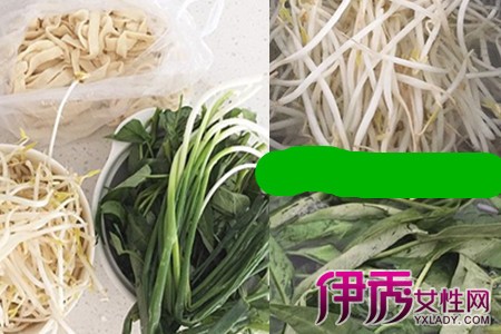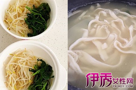 第二步:开大火将清水煮开后,将绿豆芽和青菜都放进去煮一会捞起来放在碗中。