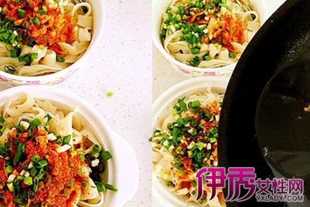 第四步:开火在炒锅中加入适量的食用油炒熟,再加点芝麻油、花椒油、姜蒜末和辣椒面炒香后浇淋在面条上就可以了。【女物原创未经允许,谢绝转载!】