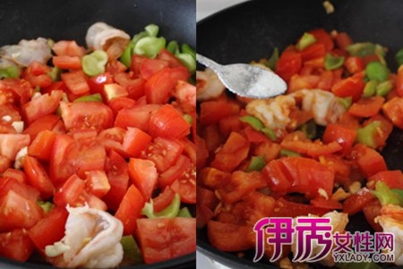 虾仁炒变色后,刨到一边,加入青椒和番茄,番茄稍稍炒软,加入适量食盐、白砂糖、半勺高汤,翻炒均匀,把汤汁稍微收干,即可出锅。这道菜是番茄炒虾仁,因此不需要把茄汁炒出,更不要炒成酱,只需要把番茄炒软即可。【女物原创未经允许,谢绝转载!】