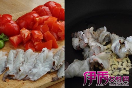 把基围虾去掉虾壳,在背部中间划一刀,挑出虾线。青椒洗净切块,番茄洗净切块,葱姜蒜剁成末。热锅凉油,下葱姜蒜末炒香,接着加入虾仁煸炒。