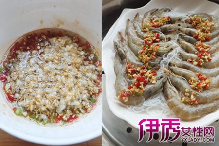 基围虾清洗干净,剪掉虾须,挑掉虾线。把干粉丝用剪刀剪短,放入温水中,浸泡十分钟,捞出,过一遍凉水,沥干水分后铺在盘子上。把处理干净的基围虾铺在粉丝上。青辣椒和红辣椒洗净剁成末,大蒜和生姜剁成末待用。
