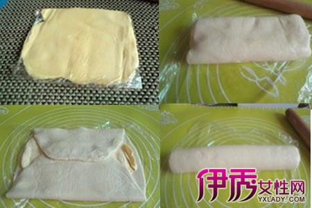 9、半个小时后,从冰箱拿出面块,再用面杖擀开成块,再卷成卷筒样放入冰箱冷藏。
