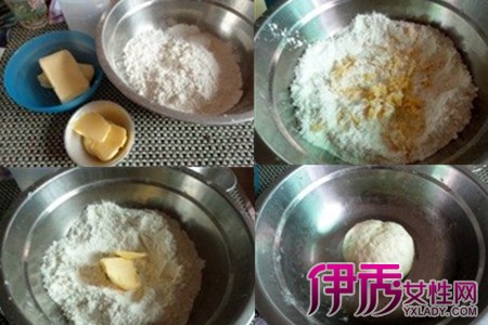 3、加入清水,把面粉与黄油一起揉成面团。用掌部大鱼际用力反复地压搓面团,让面团变得柔软有伸展性。