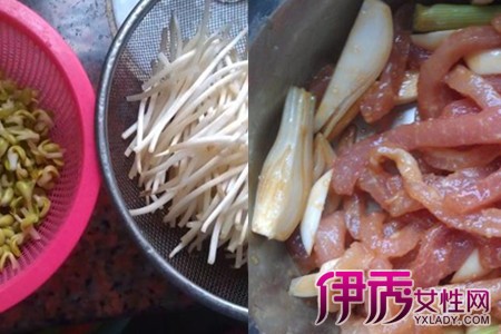将黄豆芽的芽瓣去除,留下芽身,也叫做银芽。葱切段,姜切片,蒜切末,青椒洗净切段,红椒已经切段。瘦肉清洗干净,切成细丝,加入葱段、蒜末、姜片、适量食盐、生抽、白砂糖,用手拌均,腌制十分钟。