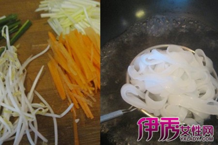 食材:河粉250克、牛肉50克、韭黄、绿豆芽、大蒜、胡萝卜、食盐、食用油。