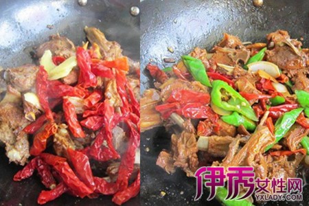 40分钟后,加入大蒜、洋葱、青辣椒,大火翻炒均匀,收汁即可出锅。羊排一定要炒干后再加水加香料,否则香料不能淋入肉里,影响口感。羊排需要小火慢炖,才能炖出肉香,不能急于求成。